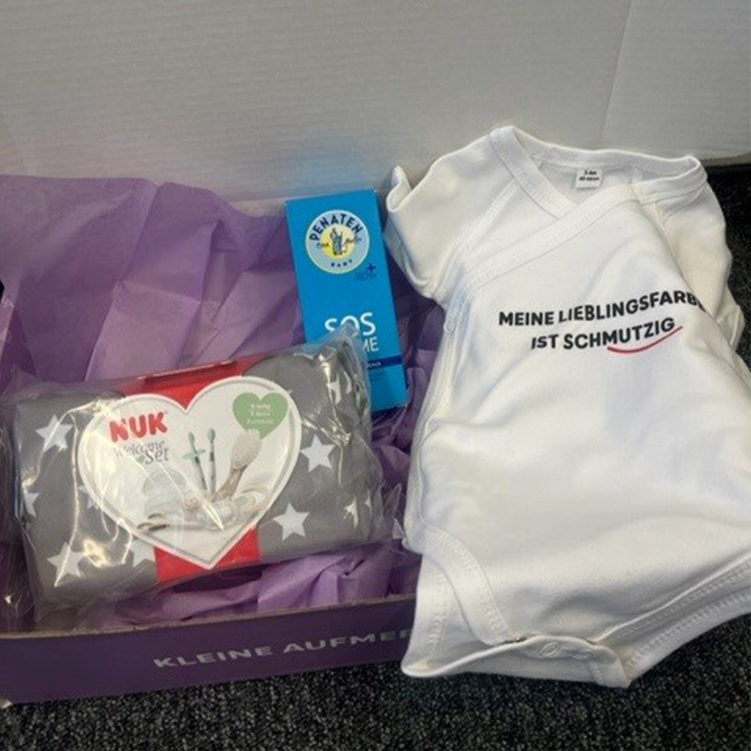 Dieses Mitarbeiter-exklusive Paket für den Nachwuchs enthält diverse Baby-Utensilien (blau – Buben, rosa – Mädchen):