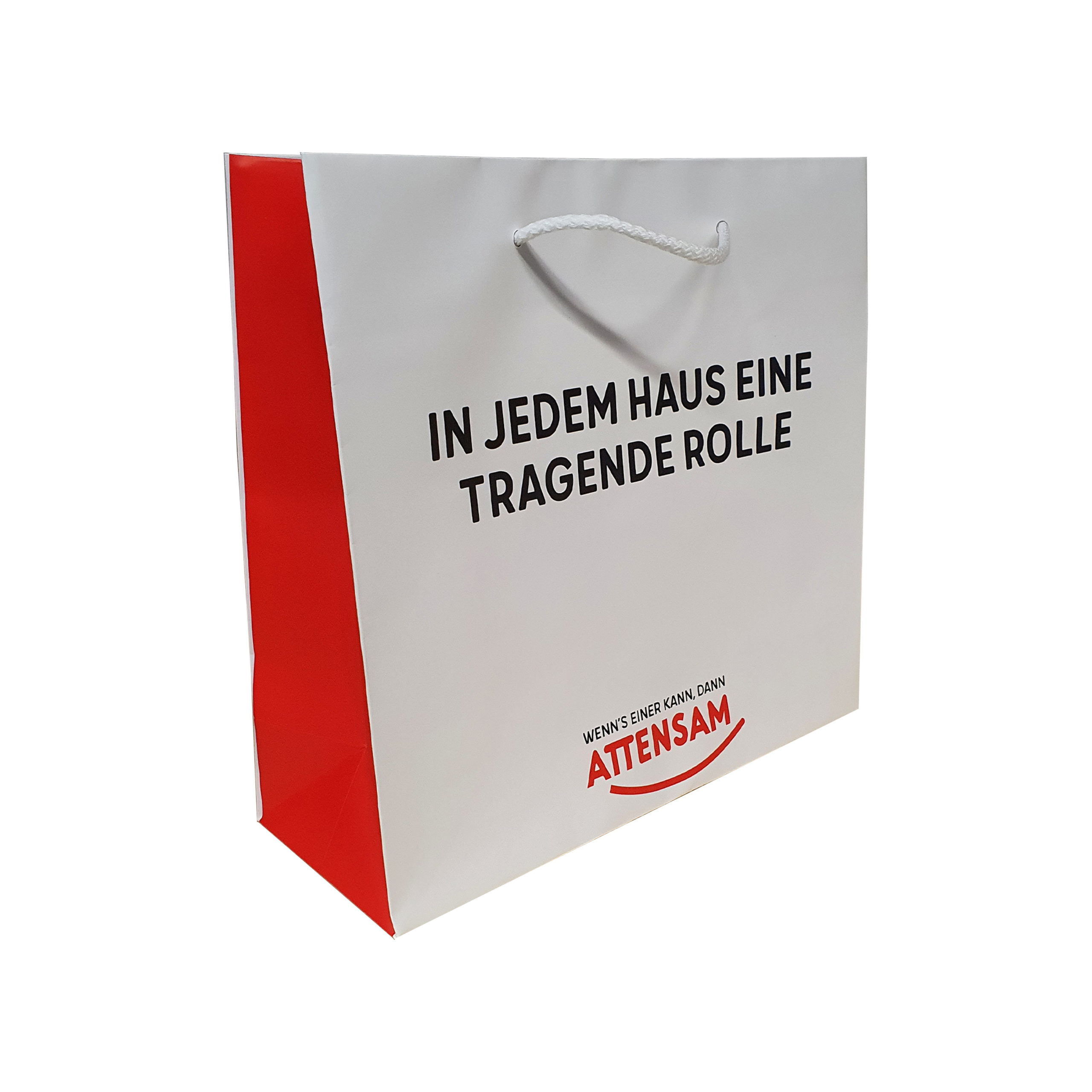 Handgemachte Papiertragtaschen mit Kartonboden, matt plastifiziert, weisse Baumwollkordeln als Griff